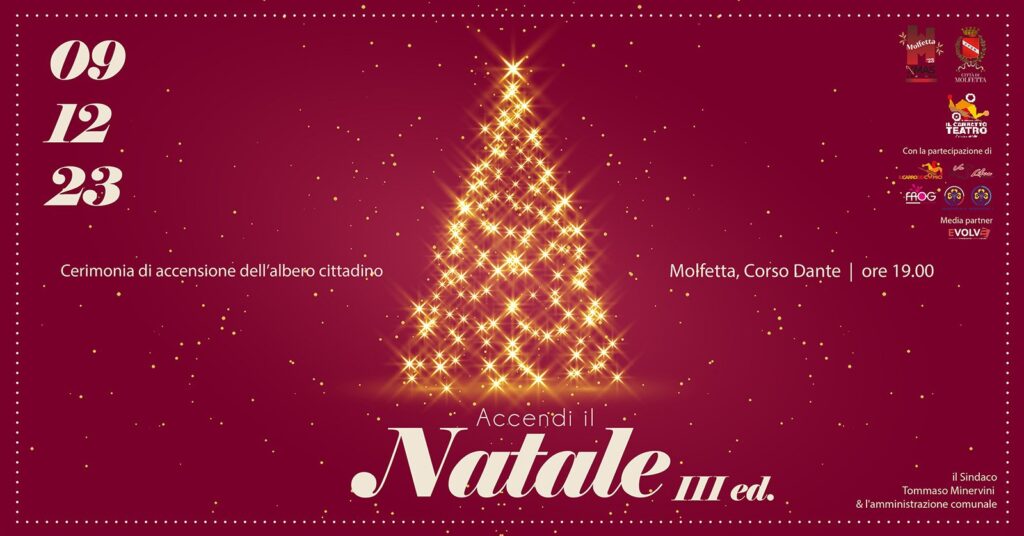 L’accensione di un maestoso albero di Natale, davanti alla Cattedrale di Molfetta, da ufficialmente il via alle festività, avvolgendo la città in un’atmosfera magica per oltre un mese. Uno spettacolo suggestivo, con musica, giochi di luce, animazione per bambini e rappresentazioni teatrali, trasformerà la piazza in un palcoscenico di emozioni.